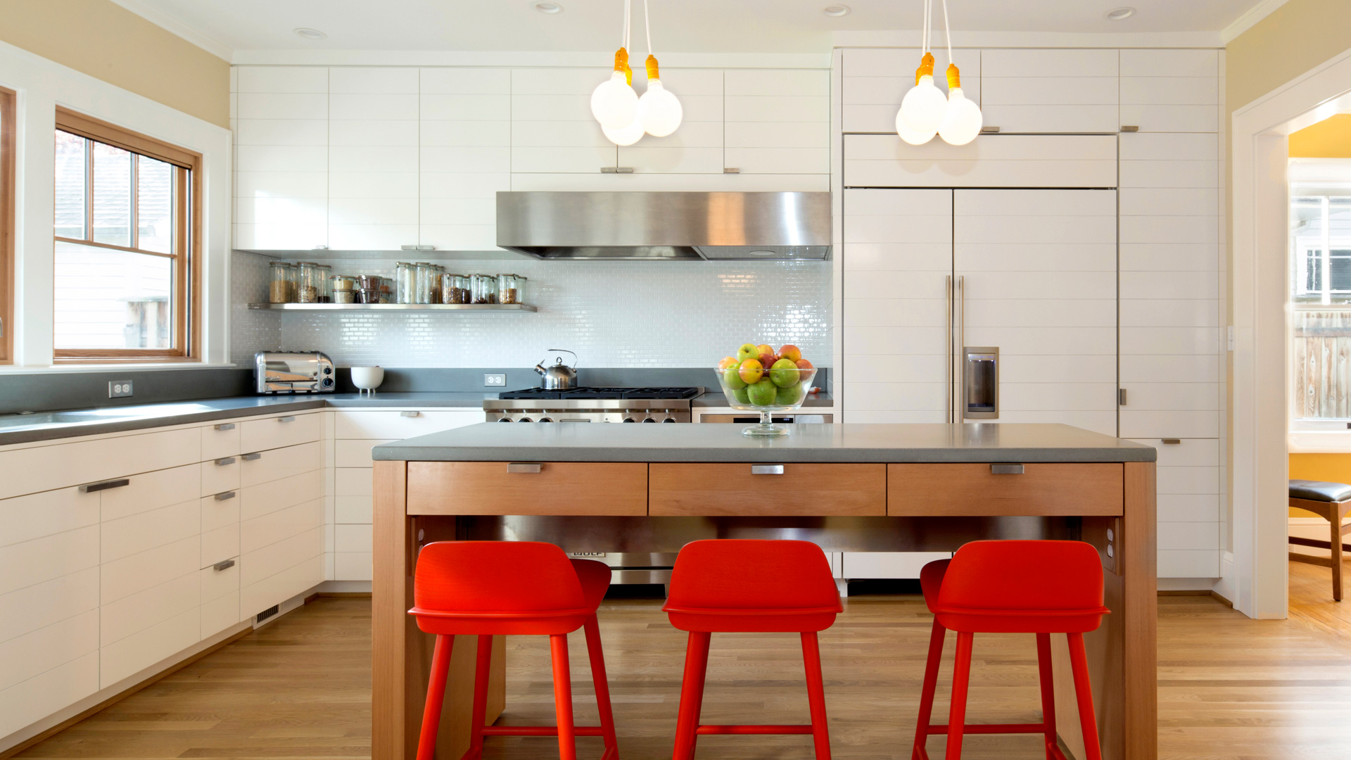 This project created a unique new kitchen in a 1920’s era Portland home. The owner’s vision of modern kitchen that was compatible with the older parts of the house was realized with concrete counters, grooved white cabinets, and a custom stainless hood surround. The kitchen is now more open to the dining room and has an expansive new view of the back yard. A new desk was also developed adjacent to the kitchen to house the family computer, cookbooks, files, as well as kids’ homework slots. In conjunction with the new kitchen, the back yard was reimagined with built-in concrete seating, fire pit, hot tub and outdoor shower.