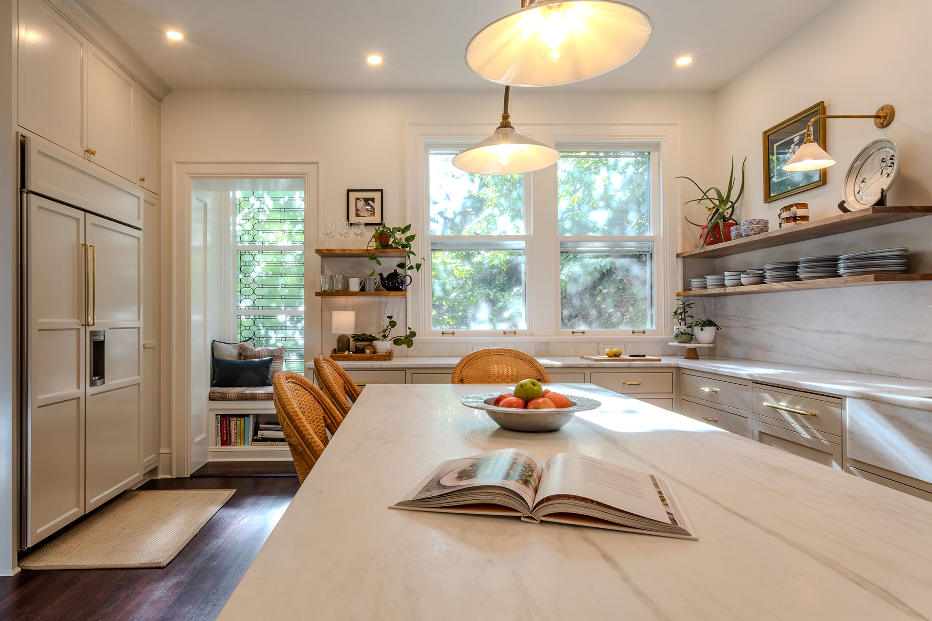 We were lucky to design a new kitchen in a beautiful historic home in NW Portland. The owners wanted a space where they could enjoy the company of friends and family. Every day use items are on on open redwood shelves, inviting guests to help themselves. The exposed kitchenware together with the marble counters and backsplash create a casual yet elegant space. An old elevator shaft with lovely leaded glasswork was converted to a little seating nook… a likely spot for the family pooch to oversee activities.