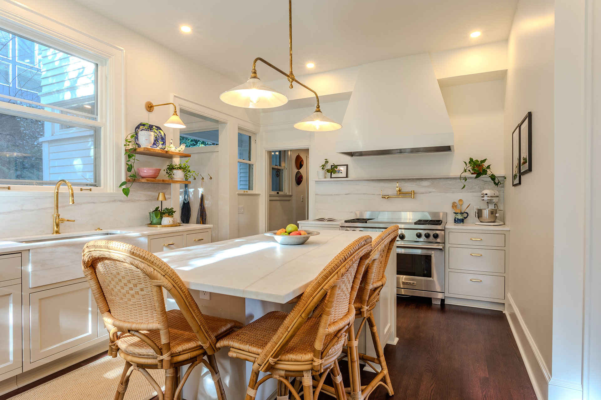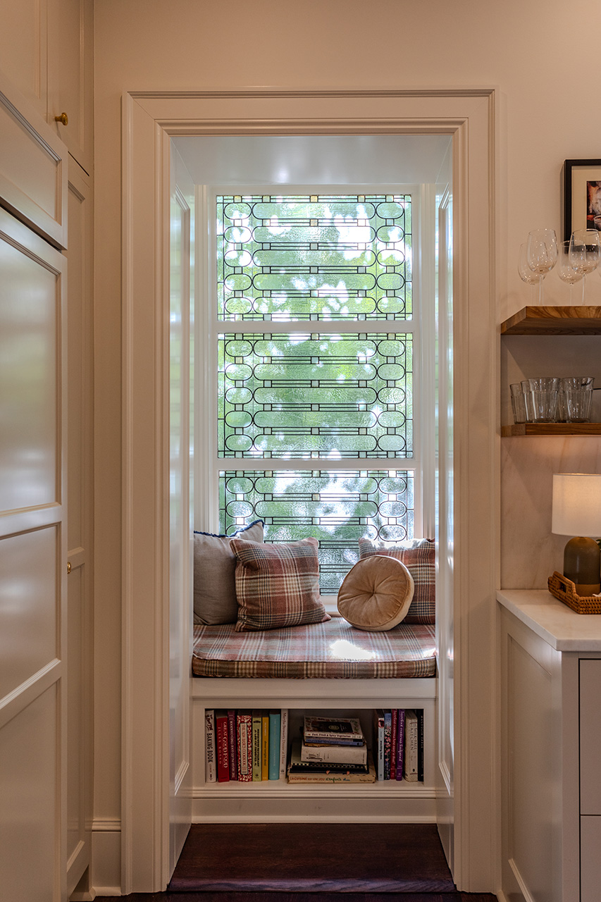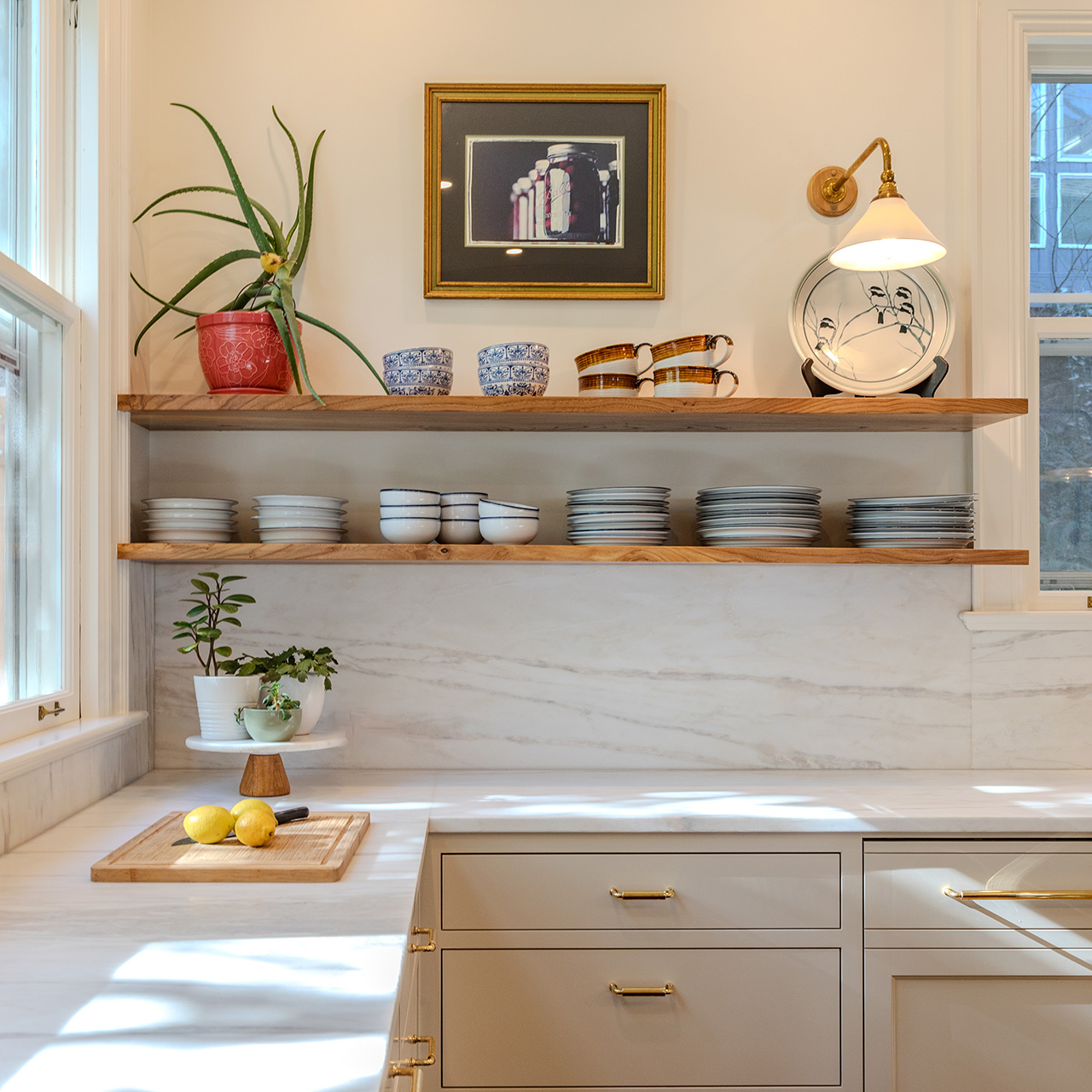 We were lucky to design a new kitchen in a beautiful historic home in NW Portland. The owners wanted a space where they could enjoy the company of friends and family. Every day use items are on on open redwood shelves, inviting guests to help themselves. The exposed kitchenware together with the marble counters and backsplash create a casual yet elegant space. An old elevator shaft with lovely leaded glasswork was converted to a little seating nook… a likely spot for the family pooch to oversee activities.